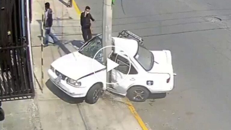 En el video captado por una cámara de vigilancia, se puede ver cómo el conductor del vehículo blanco, tipo Tsuru, derrapa sobre la calle Moctezuma Poniente, en la colonia Xico, del citado municipio, y se impacta de lado contra un poste de luz, quedando prácticamente partido a la mitad.
