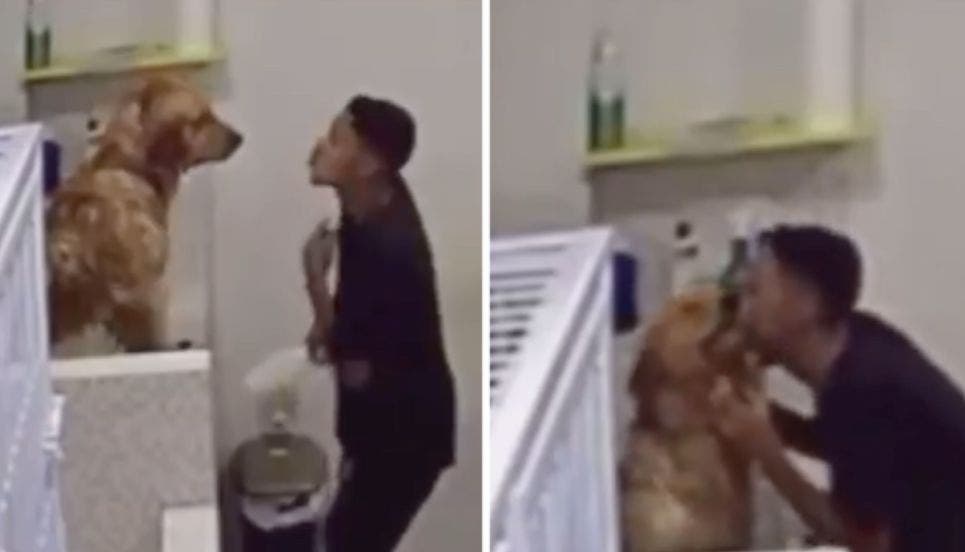 Durante la singular escena registrada por la cámara de seguridad de una veterinaria, el hombre hace de todo para que el can no sienta miedo y se deje bañar, acción que ha cautivado a los cibernautas.