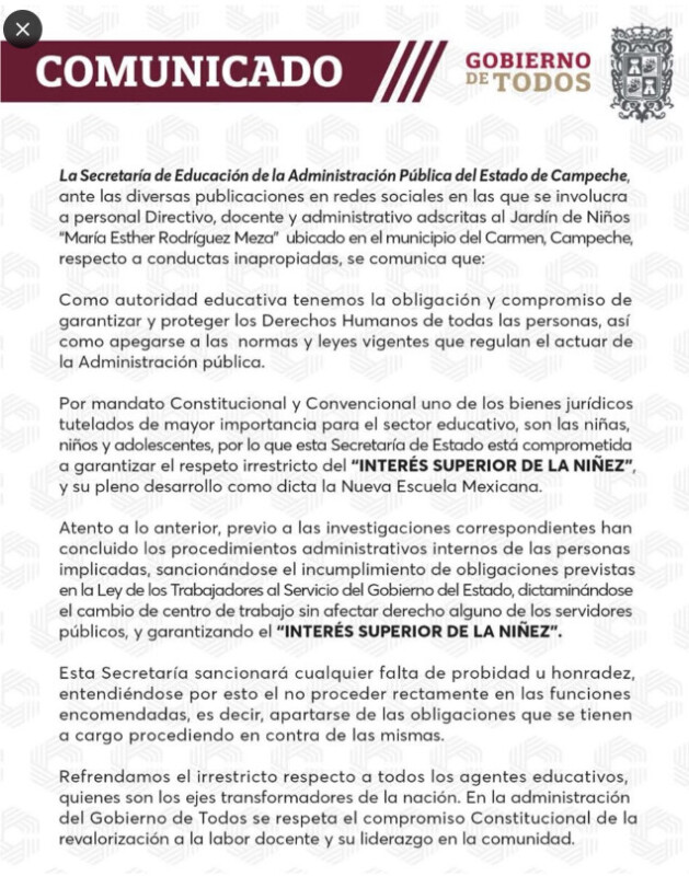 Las personas separadas de sus funciones son la directora Carolina “L.”, la secretaria administrativa Aixa “C.” y la encargada de intendencia Paulina “S.”. El despido se produjo luego de una denuncia formal de varios padres de familia, quienes enviaron una carta a la Seduc, acompañada del video que comenzó a circular rápidamente en redes sociales.