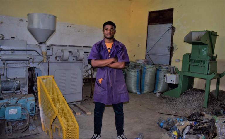 Edgar Edmund, creo un prototipo para elaborar materiales de construcción recolectando desechos plásticos de las calles de la ciudad para sus primeras pruebas.