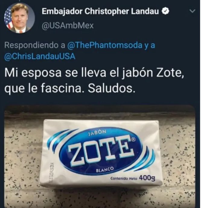 Ciudad de México.- No cabe duda que el jabón Zote no solo es indispensable en la vida de los mexicanos, también los extranjeros se han enamorado de este producto, prueba de ello, es el exembajador de Estados Unidos en México, Christopher Landau.