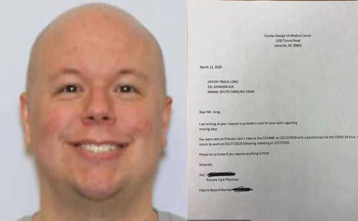 SPARTANBURG, S.C. – Jeffrey Travis Long, 31, A South Carolina man was facing charges after being accused of forging a doctor's note saying he had tested positive for the coronavirus and presenting it to his employer which shut down for five days for disinfecting. pic.twitter.com/PWinNP1xKk