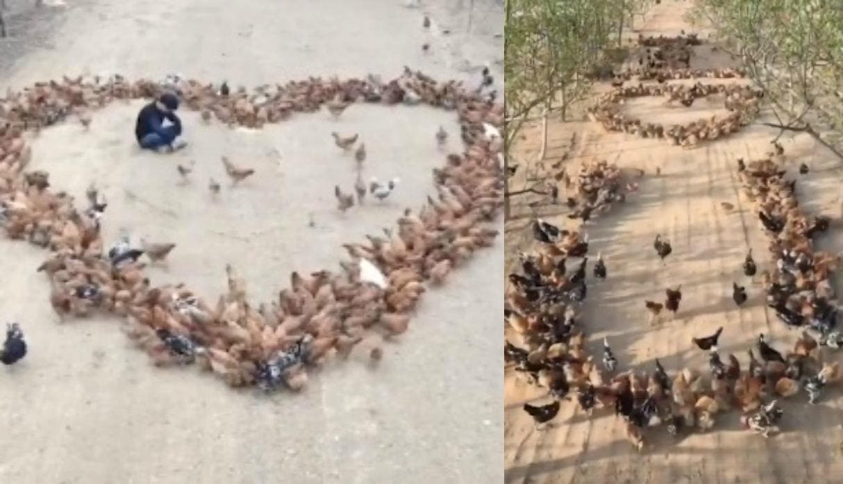 Una gran muestra de amor fue la demostró un joven granjero hacia su chica formando un corazón con gallinas en su granja.
