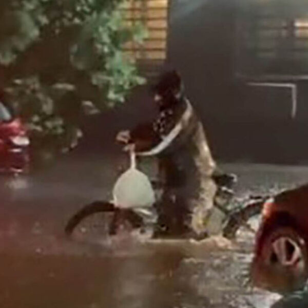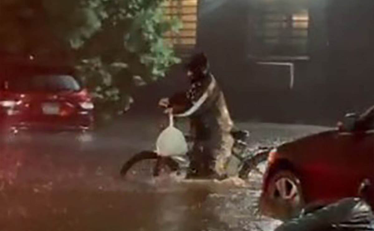 Un estadounidense firmó al repartidor de comida que viajaba en su bicicleta bajo la fuerte tormenta y con agua que le llegaba por encima de las rodillas.