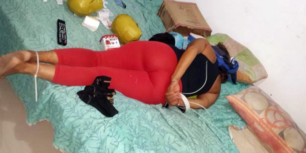 Desde hace unos días, en múltiples páginas se puede encontrar la imagen de una mujer que viste pantalón rojo con blusa negra, la cual presuntamente, fue amarrada de manos y pies por su marido.