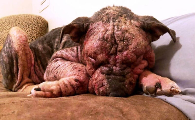 Los veterinarios le diagnosticaron sarna demodéctica e infecciones secundarias de la piel, por lo que le recetaron fuertes antibióticos y tuvo que pasar por un tratamiento agresivo.