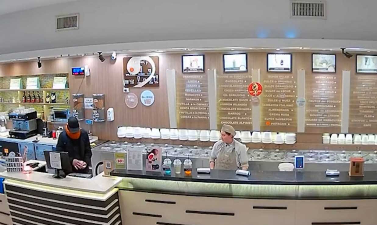 Las cámaras de seguridad de un negocio de helados captaron un insólito asalto donde el ladrón resultó muy educado al disculparse y pedir perdón a la empleada por atracar el establecimiento.