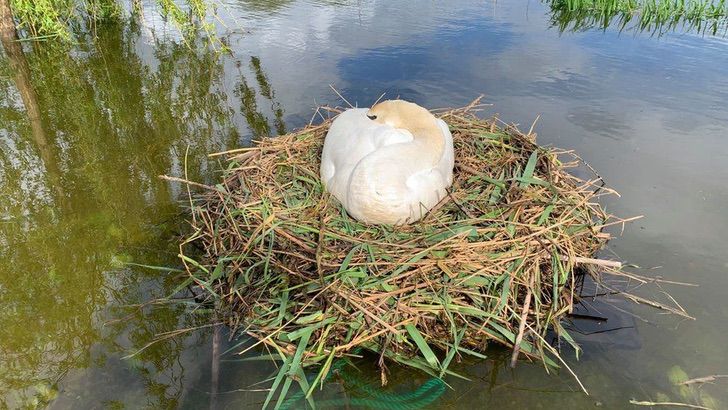 Inglaterra. – Cansado de ver como una mamá cisne cada año perdía sus huevos por las crecientes de un lago, Rob Adamson, improvisó una balsa para protegerla y pueda dejar descendencia.