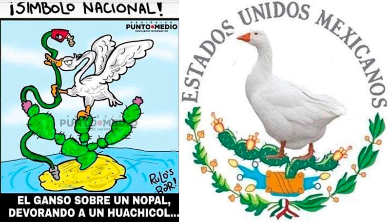 Terapéutico sentido del humor mexicano. El «nuevo escudo nacional»: desaparece la rapiña (águila) y la traición y veneno (serpiente); los sustituye un noble ganso de blanco plumaje, que recupera el control de las arterias que trasladan el líquido «vital» de la patria. pic.twitter.com/tdI865JeFN