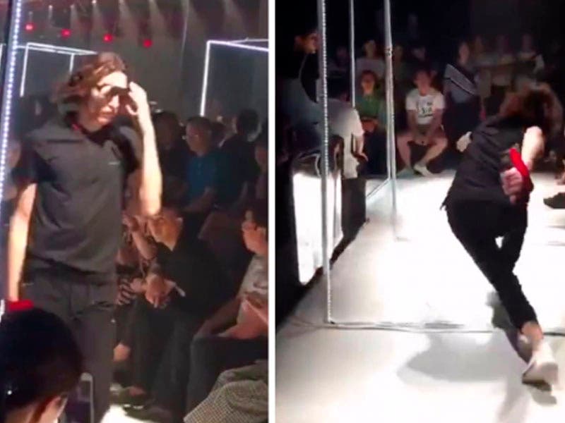 Por sorpresa, el modelo reaccionó rápido y logró frenar la caída al realizar unos raros movimientos como si estuviera bailando al ritmo de la música electrónica que estaba puesta de fondo en la pasarela.