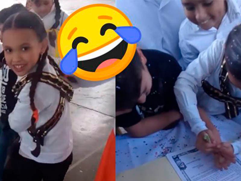 Vídeo que ha causado sensación y se ha vuelto viral en redes sociales por la forma en que la niña agarra la mano del niño con fuerza y le pone el dedo en el papel de acta de matrimonio.
