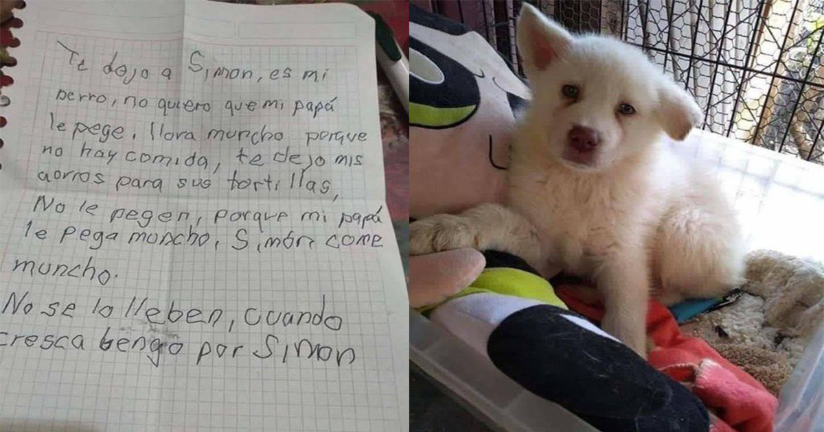 «Te dejo a Simón, es mi perro. No quiero que mi papá le pegue; llora mucho porque no hay comida. Te dejo mis ahorros para sus necesidades. No le peguen porque mi papá le pega mucho. Simón come mucho. No se lo lleven, cuando crezca, vengo por Simón», escribió el niño conmovido.
