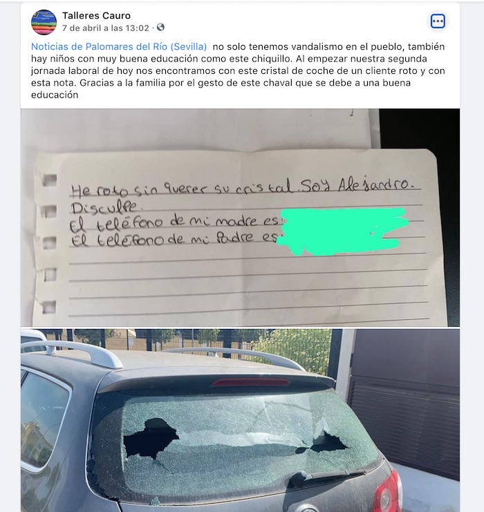 “Al empezar nuestra segunda jornada laboral de hoy nos encontramos con este cristal de coche de un cliente roto y con esta nota”, describió el sitio, denominado Talleres Cauro.