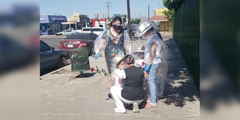 Dos menores fueron cubiertos completamente con bolsas de plástico transparentes para que pudieran estar cerca de su madre, quien es trabajadora de la salud en el estado de Chihuahua.