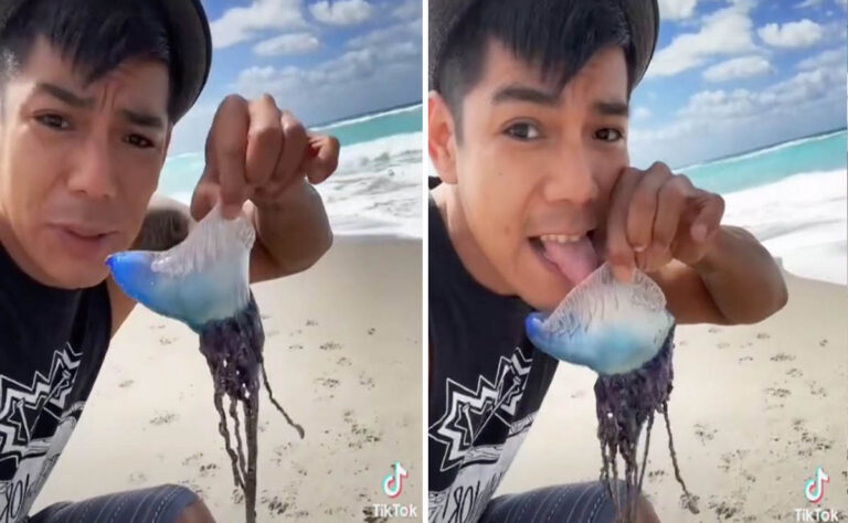 “Hola chicos, estoy aquí en la playa y miren esto, es una medusa (…) miren lo grande que es. Oh Dios mío, voy a lamerla (…) sabe salada”, dijo el tiktoker.