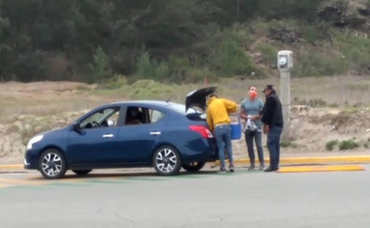 Uno de ellos, quien vestía suéter amarillo saca una hielera de la cajuela, mientras otro hace ademanes de decepción, por la aparente respuesta negativa del trabajador municipal de seguridad.