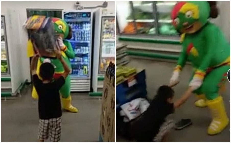 Jamás nos hubiéramos imaginado que la botarga de la mujer luchona que le declara la guerra todos los días a los precios altos en un conocido supermercado, terminaría en una batalla con un niño que de la nada comenzó a golpearla.