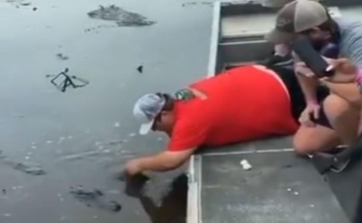 Ahí, se ve a este hombre que radica en Florida, Estados Unidos, que se encuentra en una lancha en compañía de unos amigos, de pronto se agacha para llamar la atención de un reptil salpicando el agua con su mano.