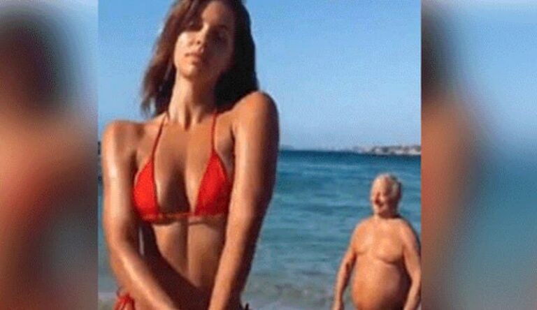 Abuelo gordo arruina sexy momento a Modelo al salir de fondo en la playa.