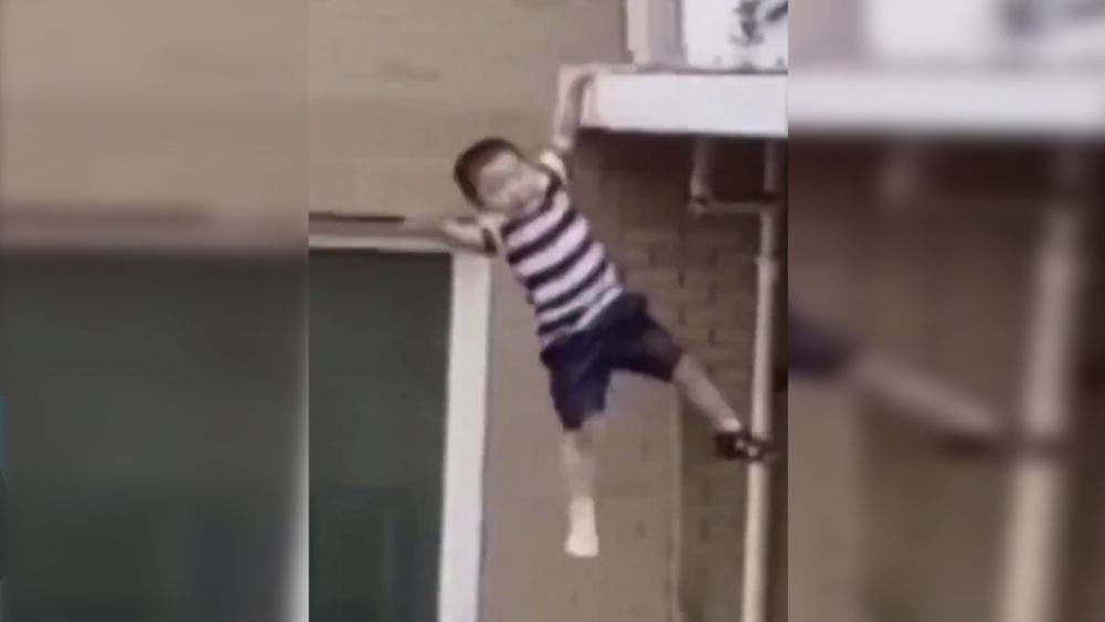 Video has been captured of a man saving a child who had crawled out onto an air conditioning unit on the fifth floor when nobody was home.