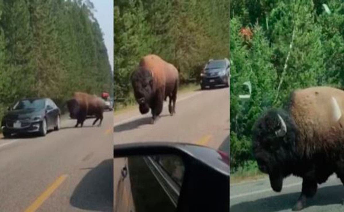 El video fue compartido por el usuario @uderconstruction2021, lo que llama la atención es ver a los animales cruzando la carretera y caminando como si nada entre los autos y de repente uno se atraviesa en su camino a lo que el enorme bisonte lo embiste.