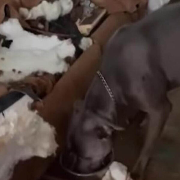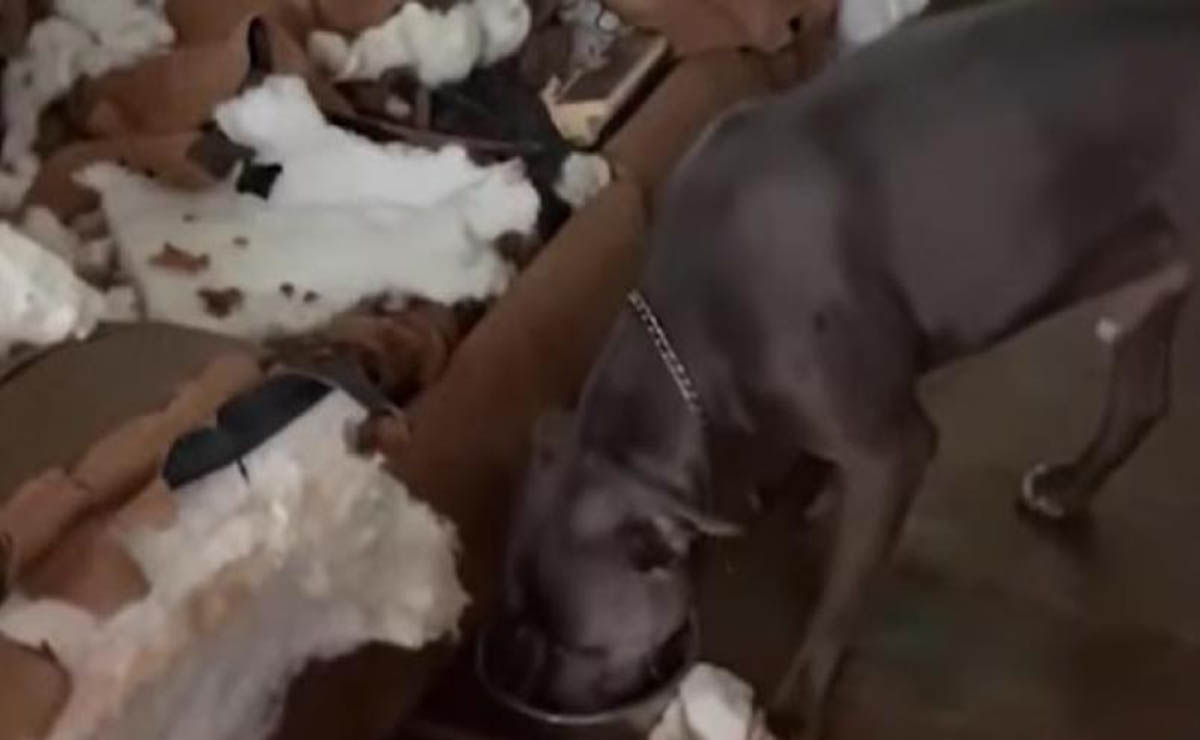 En el clip, se ve como el sofá está completamente destruido, con trozos del relleno esparcidos por todo el suelo.