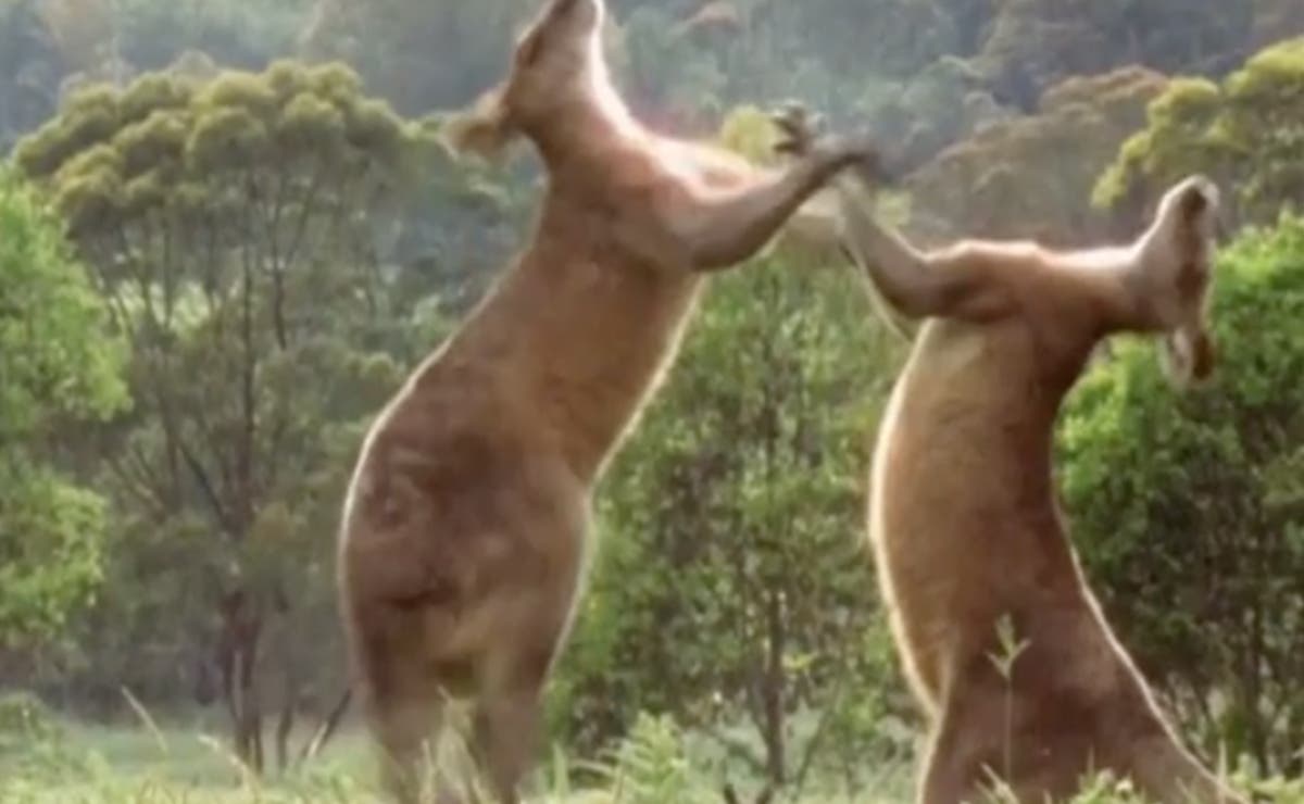 En las imágenes se observa a los dos animales, de color gris parduzco claro, balanceándose sus poderosas colas mientras se patean, se agarran y se lanzan puños. Al final del video, uno de los canguros se aleja de la escena mientras es perseguido por su rival.