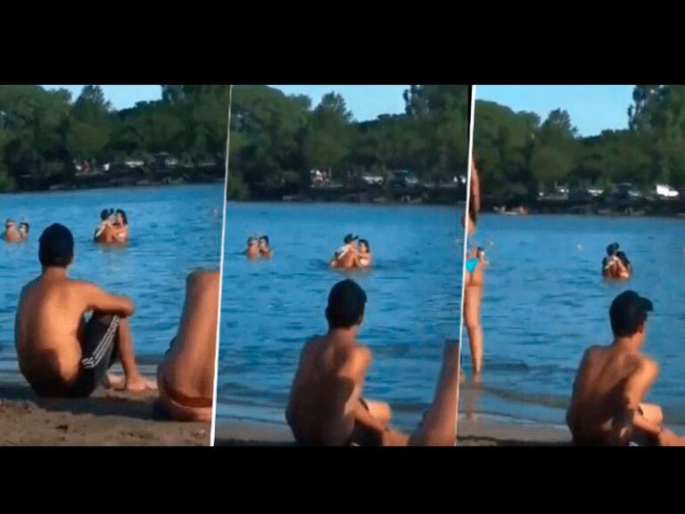 Cachan a pareja jugando en el agua ante varios bañistas.
