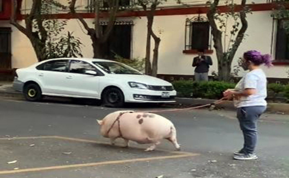 Resulta que en TikTok circula un clip en donde un joven camina con su mascota, se trata de un cerdito gigante que se contonea por las calles generando el asombro de los transeúntes.