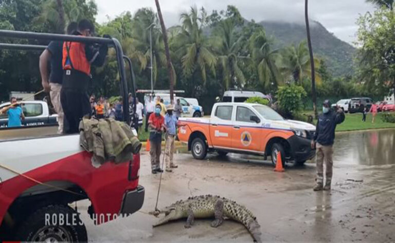 Acapulco. – Las lluvias ocasionadas por la tormenta tropical «Dolores» en Acapulco, provocaron que un despistado cocodrilo saliera de su hábitat y deambulará por la entrada principal de la playa El Revolcadero.