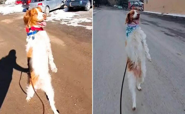 Así es, que increíblemente el perro aprendió a caminar erguido sobre sus dos patas traseras, como un humano, algo que sorprendió a todos.