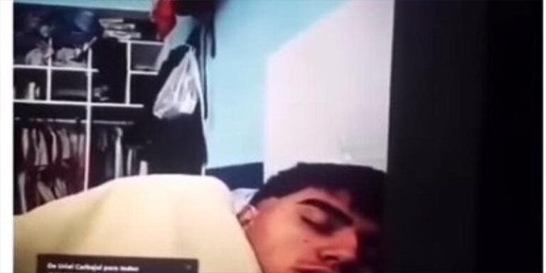 Al ver a su estudiante dormido, el profesor decidió grabar el momento y viralizarlo en redes sociales: «No me había pasado nunca. Se me duermen en clases, pero en la cama no se me habían dormido nunca» se escucha decir al profesional.