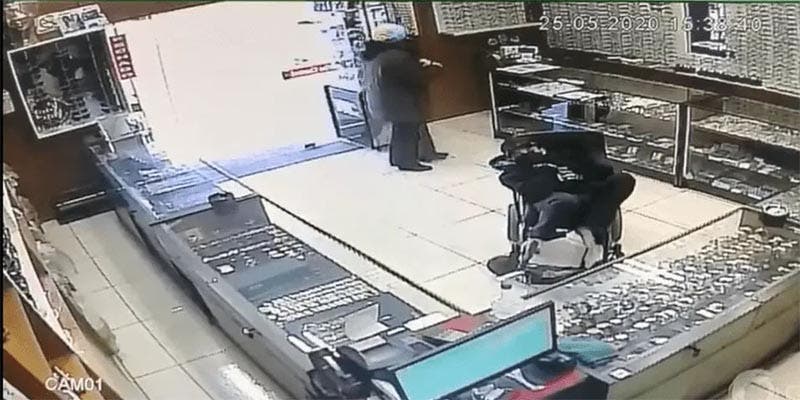La cámara de seguridad del establecimiento captó el momento en el que el que el agresor, quien no cuenta con ambos brazos, intenta asaltar la joyería con los pies.