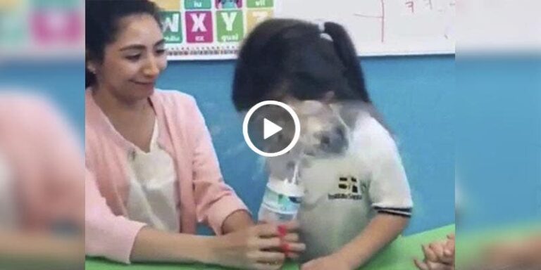 No obstante una alumna se acerca para ser la voluntaria, la menor acerca su cara a la botella sin embargo luego de hacerlo la maestra aprieta la botella y empapa a la menor, al igual que otras estudiantes.