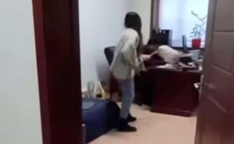 Los hechos quedaron grabados en video, el cual se viraliza, ahí se ve a la mujer entrar a la oficina del sujeto y comienza a golpearlo.