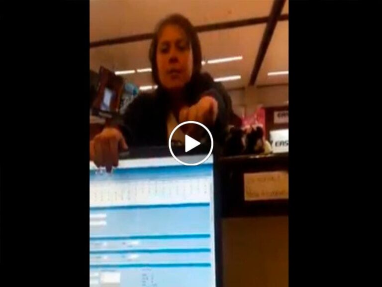 En las imágenes se observa como una mujer, fuera de control, toma las computadoras del mostrador y las arroja contra el piso.