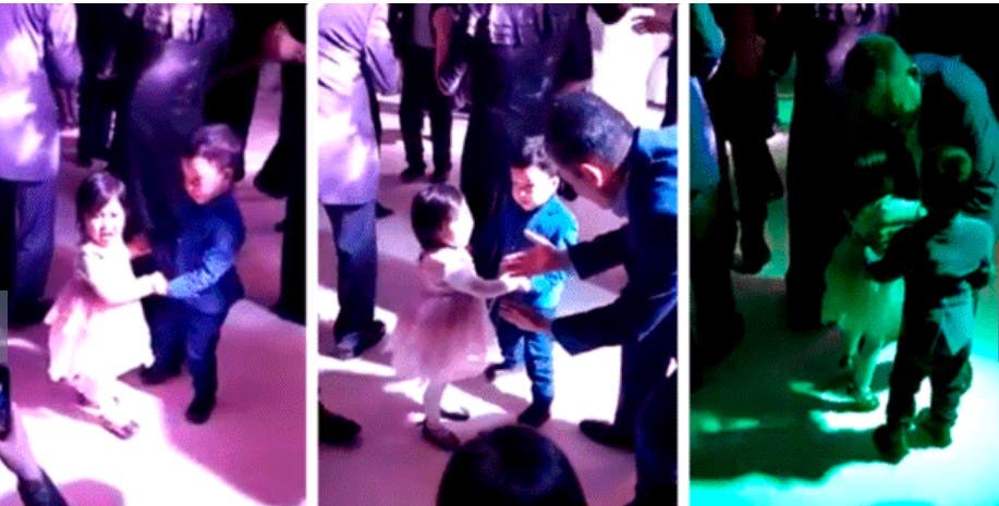 Como se ve en las imágenes, el niño estaba gozando del baile con la niña hasta que llegó el apdre de la menor para llevársela de manera sorpresiva y el infante estaba tan enojado que le pegó en la pierna al hombre.