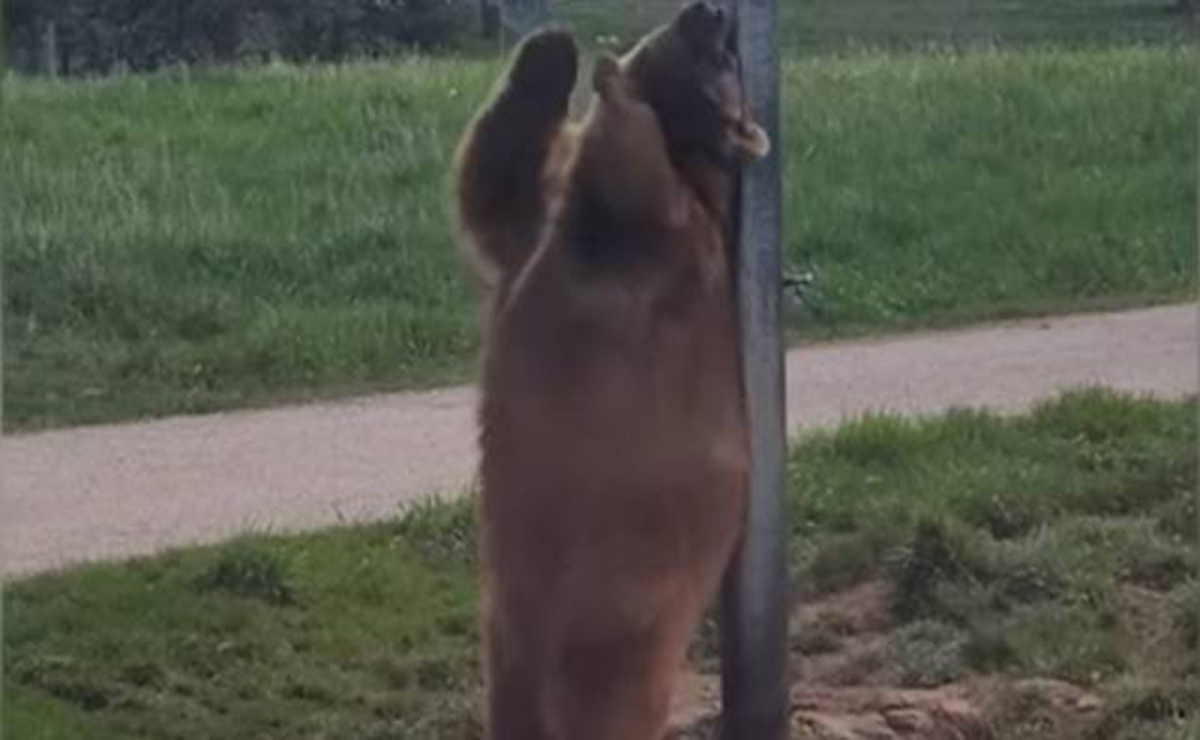 Sin bien al principio del clip, se ve al oso sentado junto al poste, hasta que de repente, el animal se levantó sobre sus patas traseras y comenzó a restregar su espalda contra la estructura metálica.