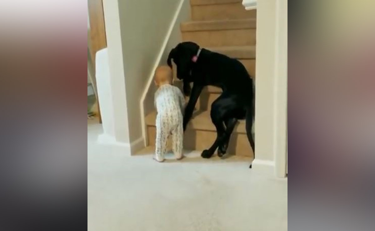 La acción del peludo quedó grabado en video, ahí se ve como el perro ataja al bebé para que no suba la escaleras.