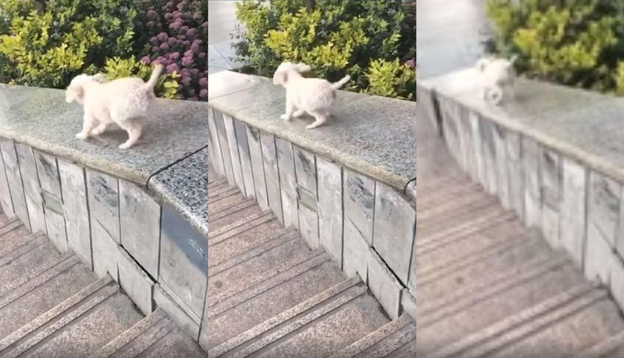 El cachorro aprendió a bajar del barandal sin ayuda de nadie y que también ha causado ternura en las redes sociales.