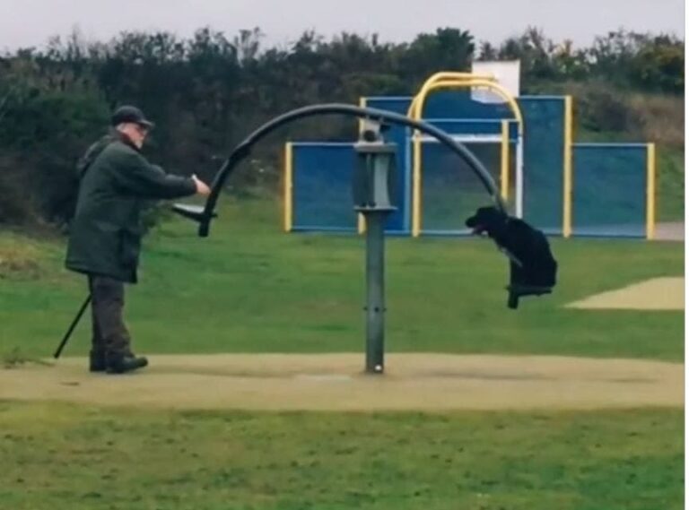 Ahí, se ve como el perro está sentado en un juego para niños, mientras su humano le da vueltas, imprimiendo una escena muy tierna.