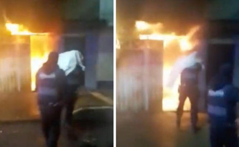 «Fueron informados que al menos dos hombres estaban atrapados en uno de los cuartos, y basados en sus conocimientos de primeros auxilios, dos oficiales de la PBI mojaron sus uniformes y dos toallas que un hombre les dio e ingresaron al predio», se puede leer en el comunicado que desplegó la dependencia.