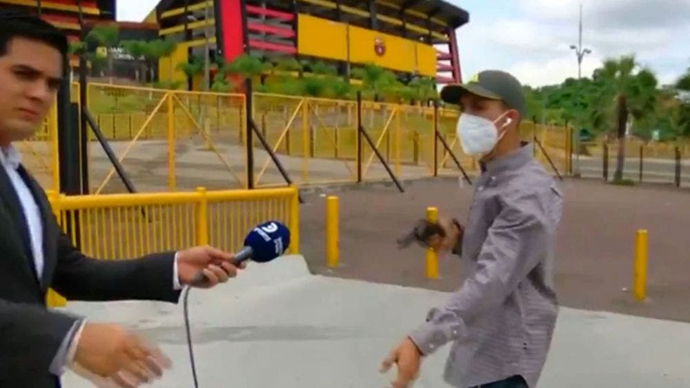 El reportero Diego Ordinola de DirecTV se aprestaba a transmitir en vivo cuando un joven con pistola en mano llegó a amenazarlos a él y su camarógrafo, ellos estaban afuera del Monumental de Quitó, Ecuador, alrededor de las 13 horas locales.