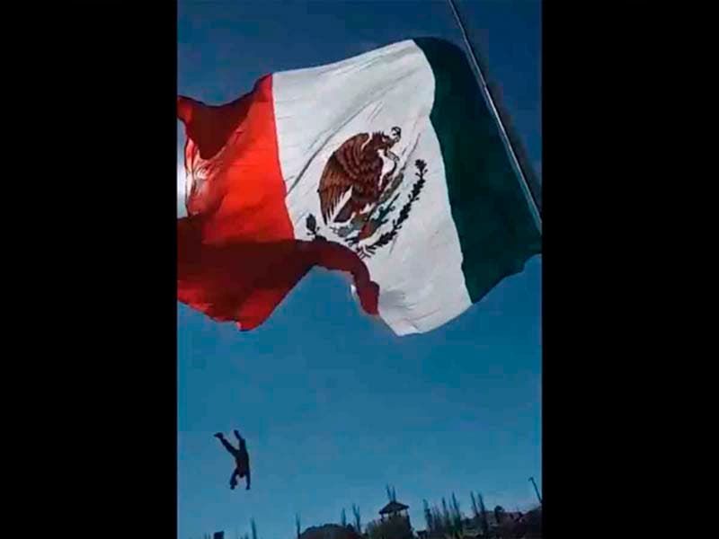 El izamiento de la Bandera Nacional en El Palomar, Chihuahua que se llevó a cabo por el natalicio de Juan Escutia, está compartiéndose en las redes sociales debido a que un soldado se enredó con el Lábaro Patrio y cayó desde 7 metros de altura.