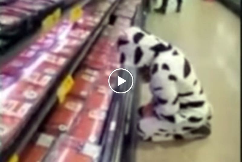 Vegana disfrazada de vaca llora en el supermercado frente a las carnes.- Una mujer originaria de Australia se manifestó en un supermercado de su localidad, al acudir disfrazada de vaca y llorar frente a las carnes que estaban en el refrigerador.
