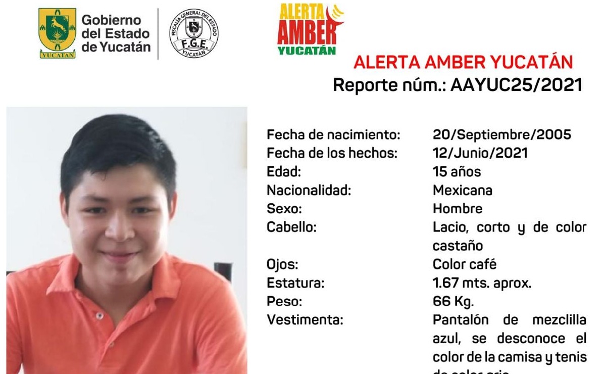 En el Estado de Yucatán, activan la Alerta Amber para localizar a un menor de 15 años de edad, quien fue visto por última vez el pasado 12 de junio en Mérida.