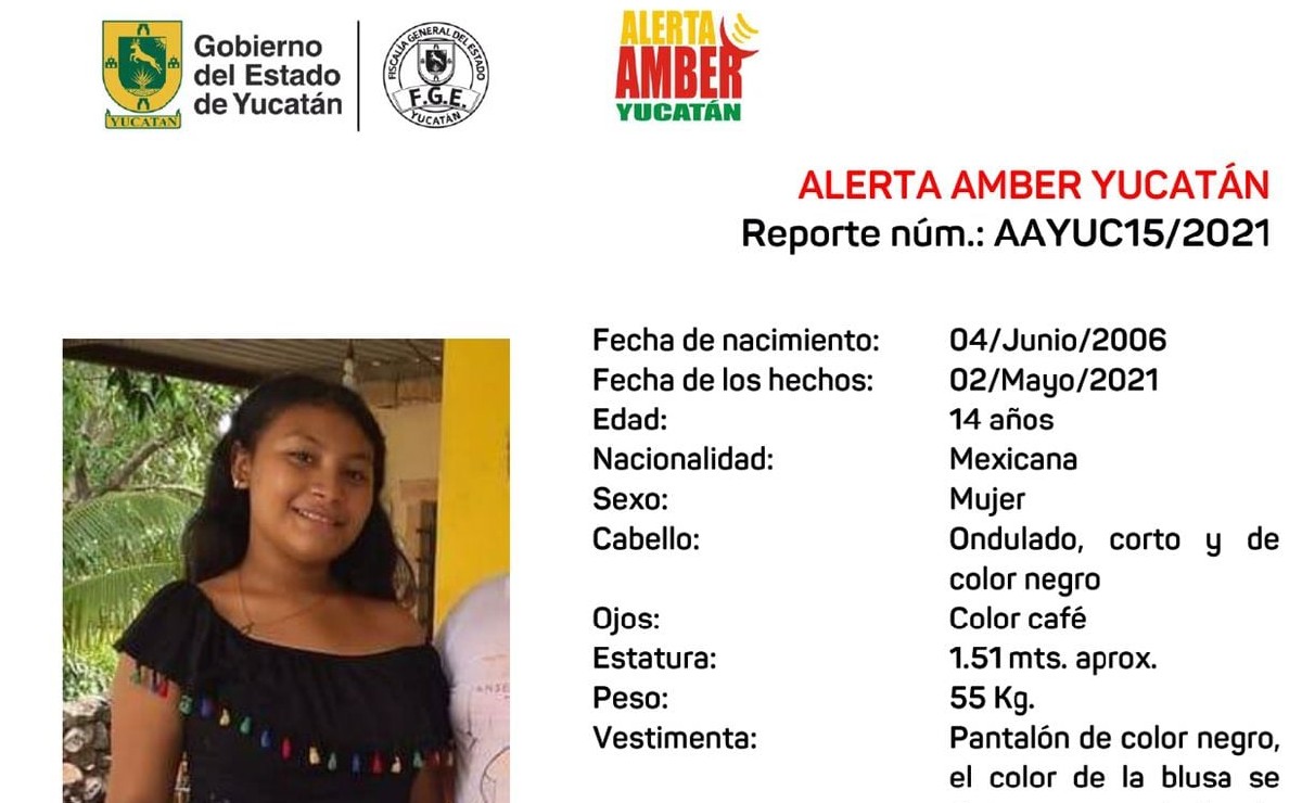 En Mérida, activan la Alerta Amber para localizar a una menor de 14 años, reportada como desaparecida desde el pasado 2 de mayo.