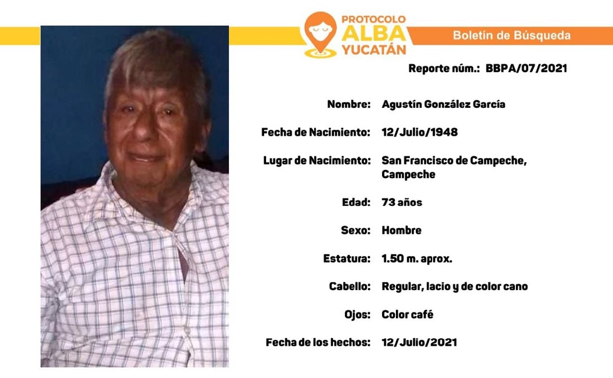 La Fiscalía General del Estado de Yucatán (FGE), activó el Protocolo Alba para dar con el paradero del señor Agustín González García de 73 años de edad, quien fue reportado como desaparecido por sus familiares tras ser visto por última vez al salir de su casa ubicada en la colonia Cuauhtémoc de Kanasín el pasado 12 de julio del presente año.