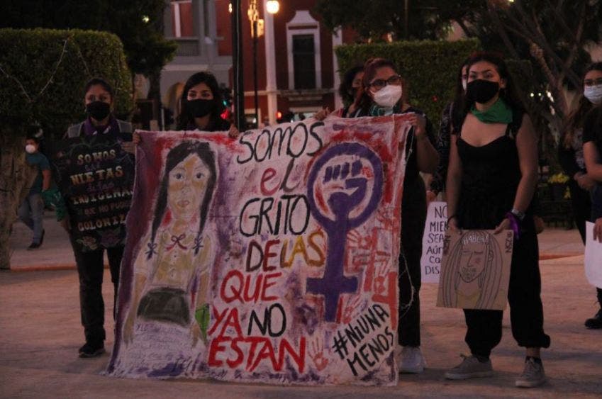 Alrededor de un centenar de mujeres, se manifestaron en la Plaza Grande de Mérida, con pañuelos y carteles, exigiendo la eliminación de violencia de género en el día “conmemorativo” del 25 de Noviembre.