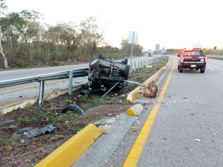 Un conductor ‘fantasma’ abandonó su vehículo destrozado tras volcar sobre la vía Mérida-Campeche.
